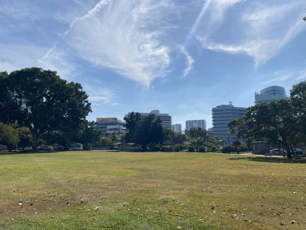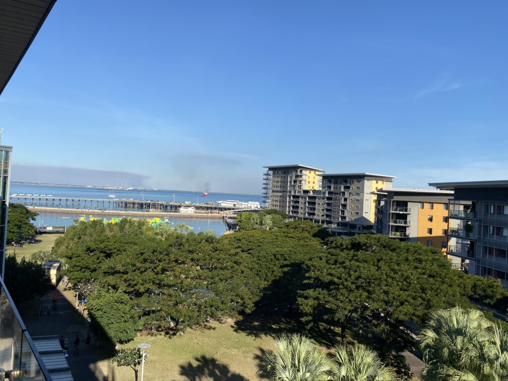 Heute ist geht es eher darum, die Ferien auszuplampen. Am Morgen erledigen wir das Check-In für die Flüge und machen uns anschliessend noch daran, im Park die Displays zur Geschichte von Darwin und dem Überfall der Japaner im 2. Weltkrieg anzusehen. Vue auf unser Hotel vom Park aus: