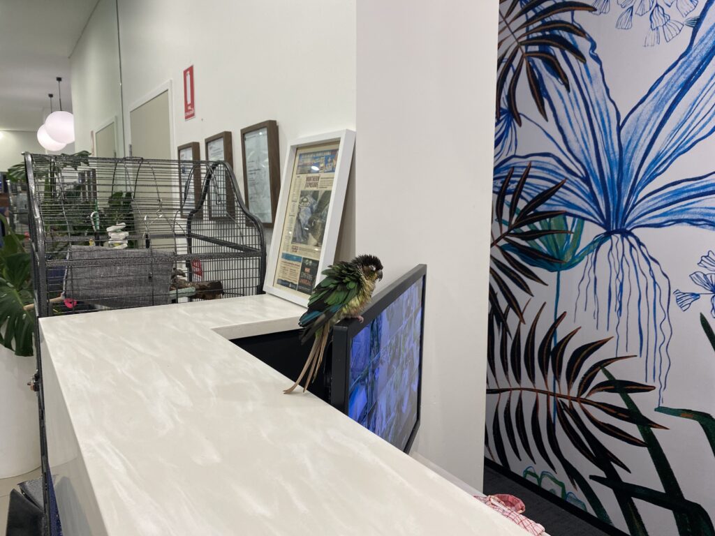Pickels, der Hauspapagei, ist heute etwas munterer am Morgen, als wir bei der Rezeption vorbeischauen, um unser Gedeck für das Frühstück abzuholen: