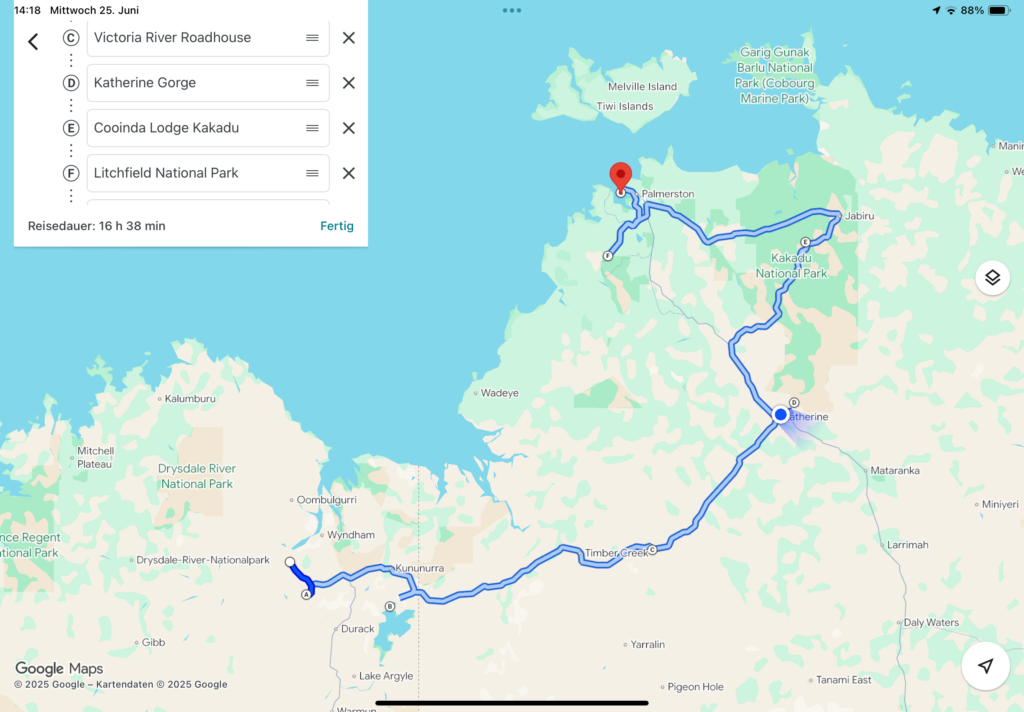 Der Plan ist, dass wir als Nächstes am 20.6. (A) El Questro besuchen. Danach erholen wir uns zwei Tage vom 21.6. -23.6. am (B) Lake Argyle. Unterwegs nach Katherine am 23.6. irgendwo übernachten (C), dann 2 Tage bis am 26.6. in (D) Katherine verbringen und dort die Katherine Gorge besuchen. Wir buchen vom 26.6.-28.6. zwei Nächte und eine Flussfahrt im Kakadu Nationalpark (E) und werden noch vom 28.6.-30.6. zwei Tage im (F) Litchfield Nationalpark bei Darwin verbringen. Danach ist unsere Campingzeit abgelaufen, wir verlängern unseren Aufenthalt im Hotel in Darwin (G) und werden von dort aus vom 30.6. bis zu unserer Abreise am 5.7. die Umgebung von Darwin erkunden. Der Plan auf Karte