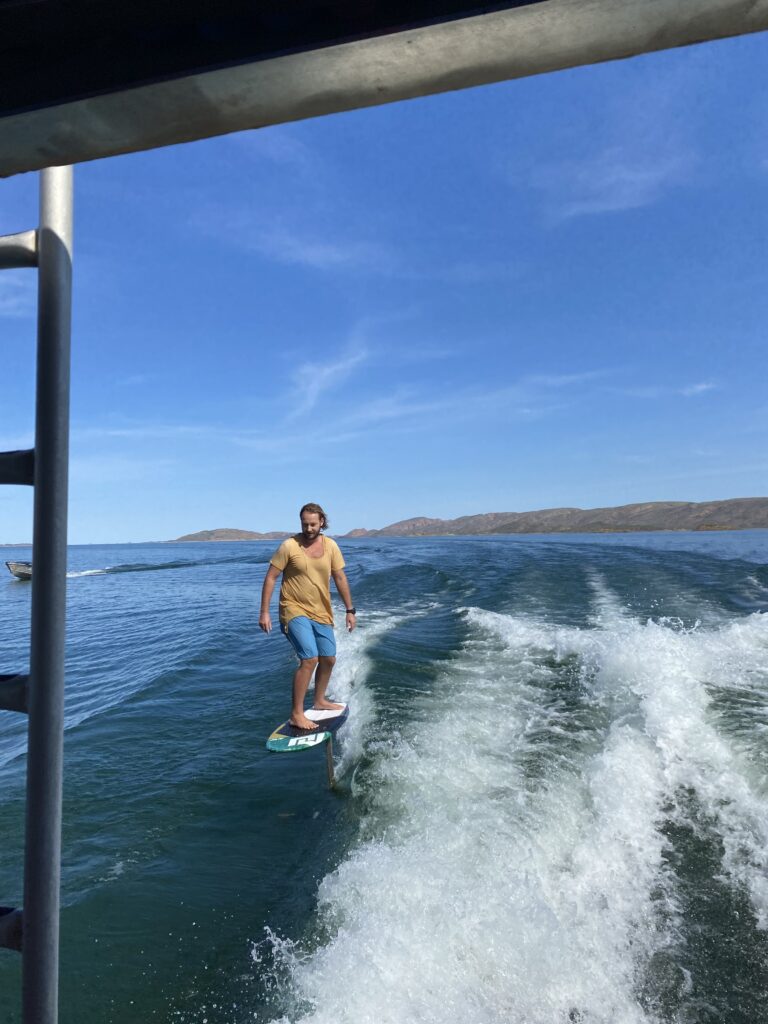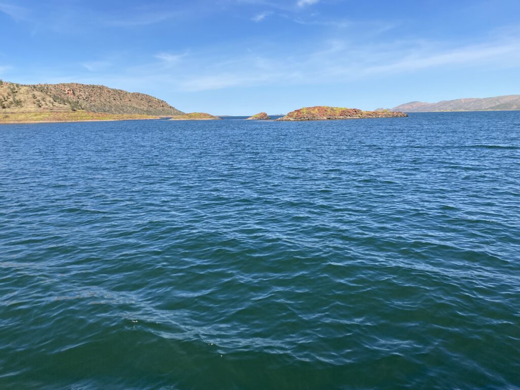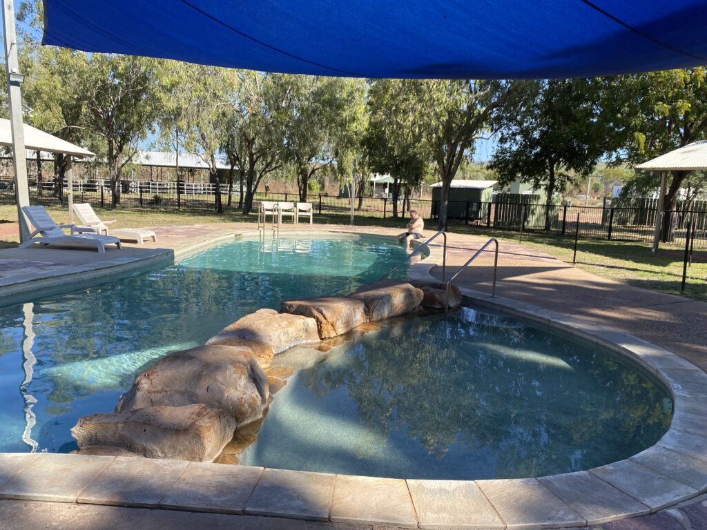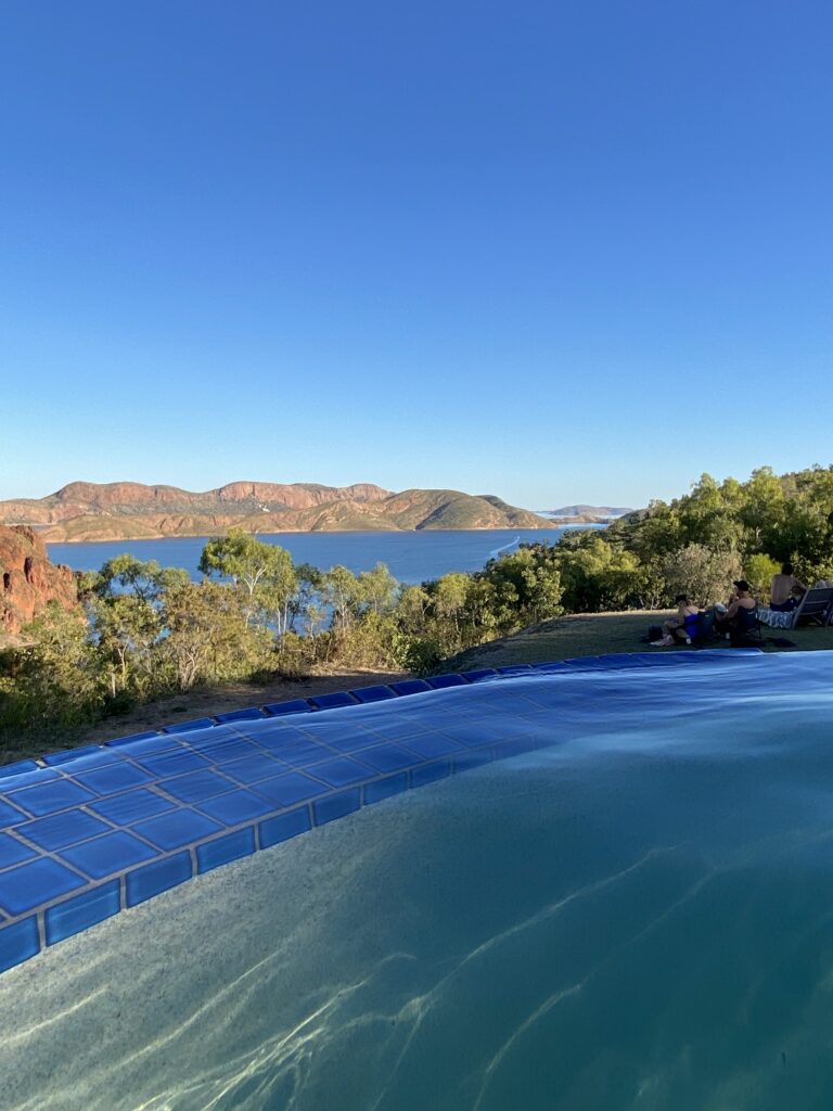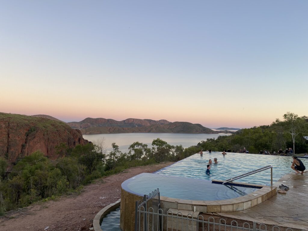 Am Lake Argyle angekommen buchen wir für morgen eine Schiffstour auf dem See. Danach gehen wir in den wunderbaren Pool mit Aussicht auf den See baden: