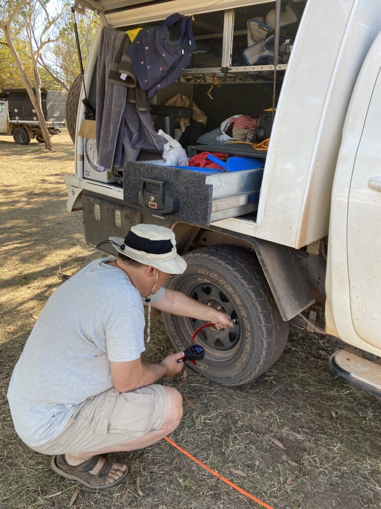 Am Morgen machen wir Sophie wieder bereit für die Fahrt auf asphaltierter Strasse indem wir die Reifen mit dem On Board Kompressor wieder aufpumpen.