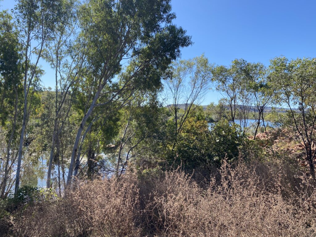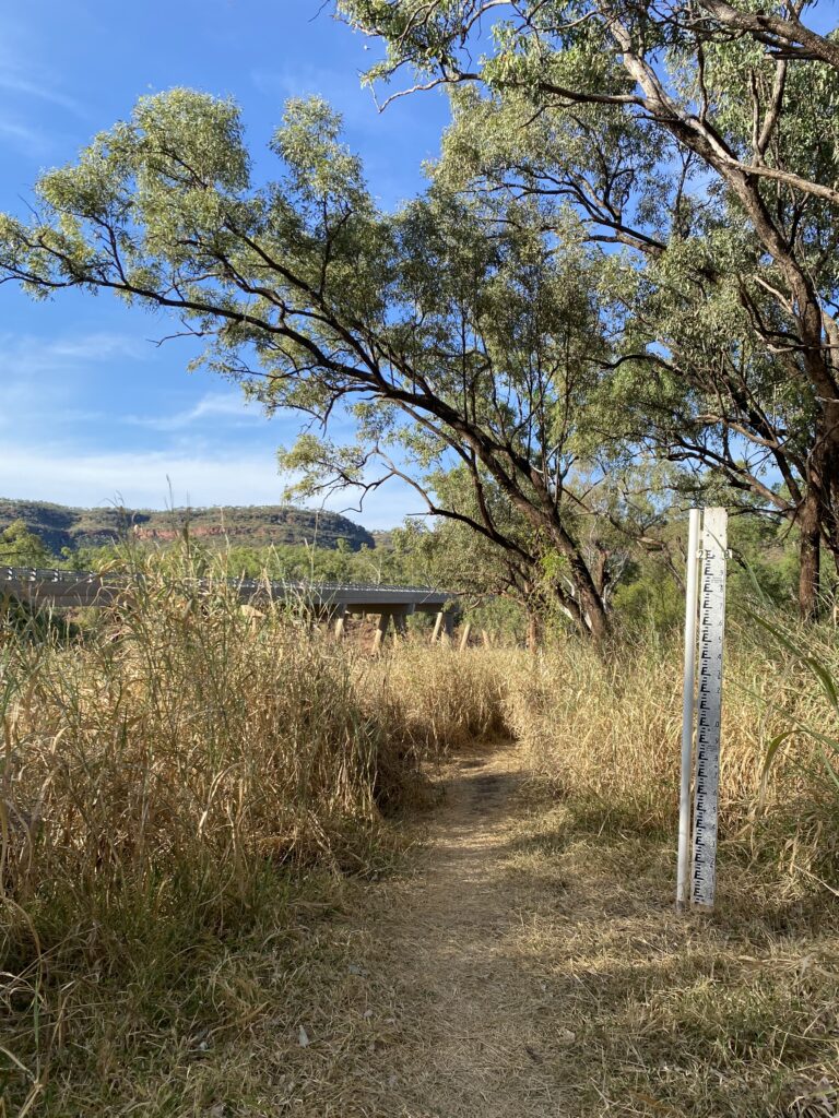 Am Ufer sieht man Pelemesser. Die deuten darauf hin, dass die neue Brücke wohl desshalb höher gebaut wurde, weil hier das Wasser des Victoria Rivers sehr hoch werden kann.