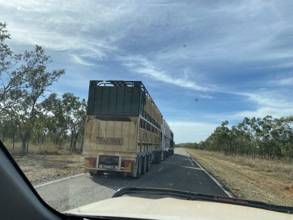 Unterwegs auf dem Victoria Highway gibt es natürlich wieder Road Trains zu überholen. Hinter dem nachzufahren macht keinen Spass. Das riecht zu stark